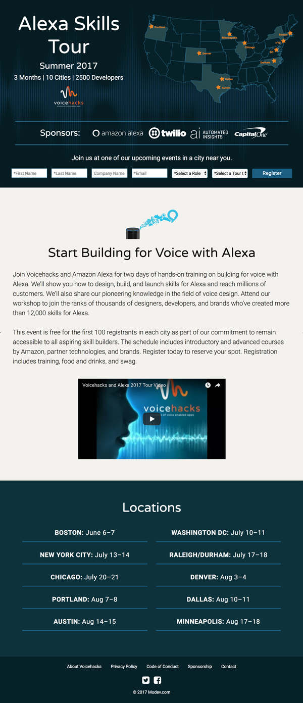 In Summer of 2017 we worked with Amazon to deliver a 10-city Alexa Skills training tour- resulting in more than 1850 registrations and hundreds of new Skills published.